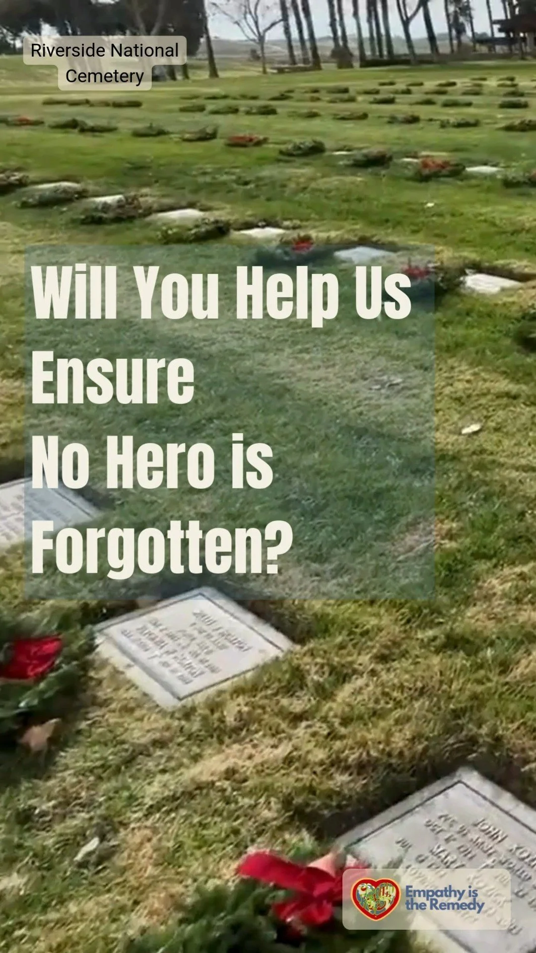 On December 13, 2025 at 09:00 am, Empathy is the Remedy Foundation (CA0664P) will Remember and Honor our veterans by laying Remembrance wreaths on the graves of our country's fallen heroes at Riverside National Cemetery.